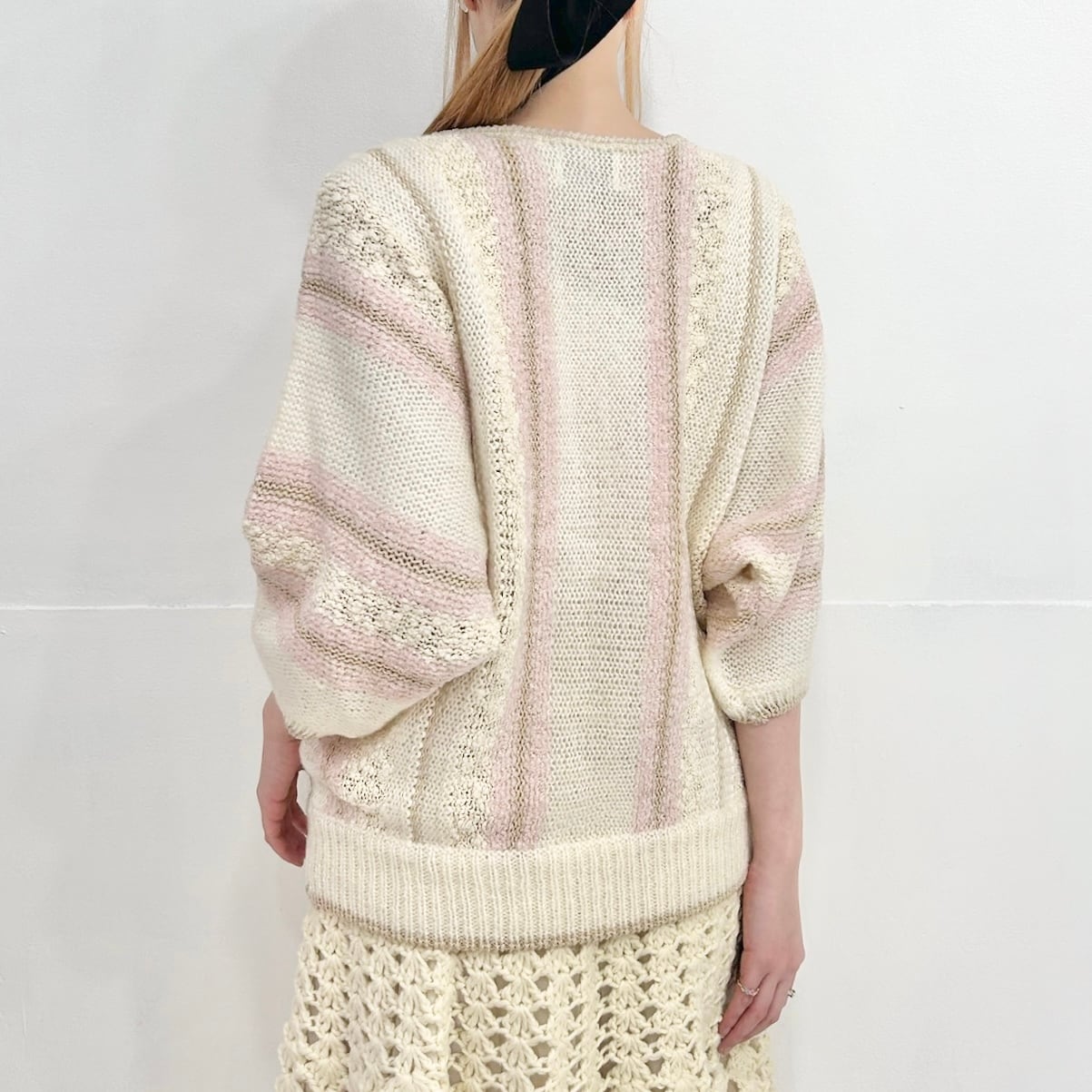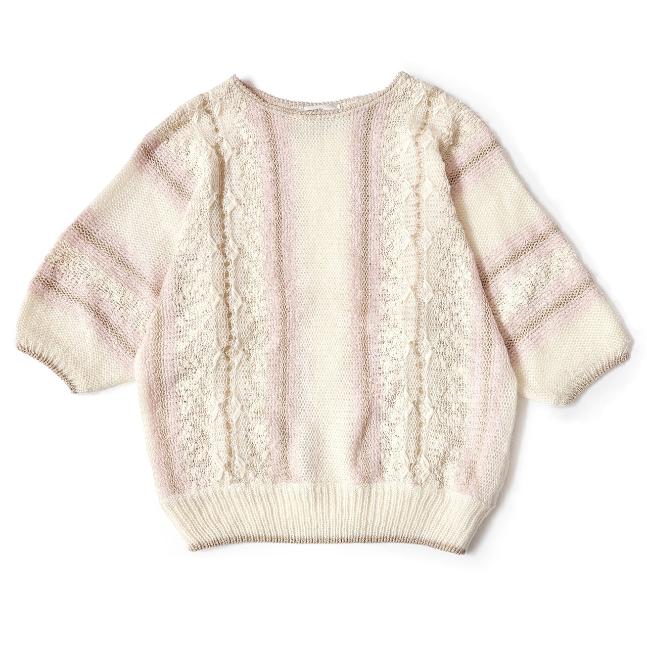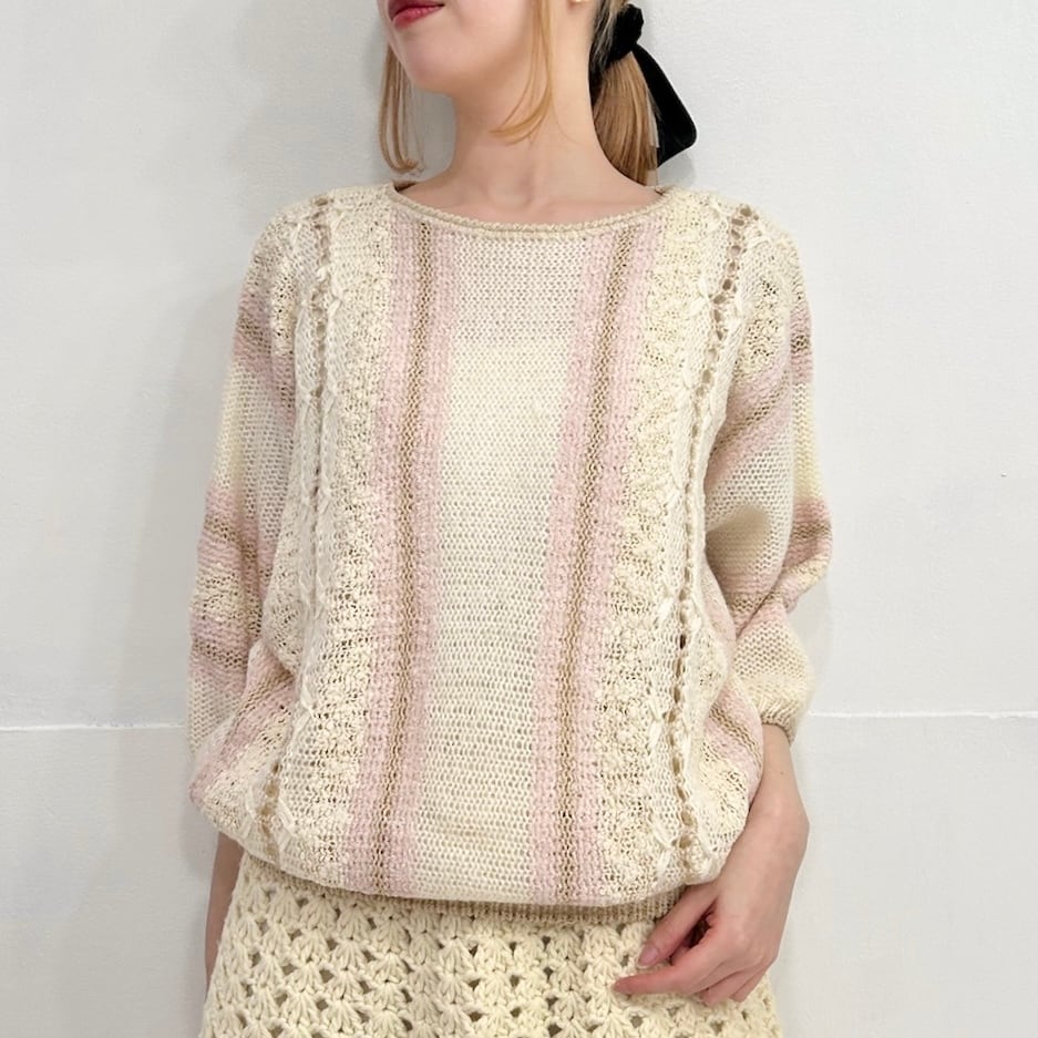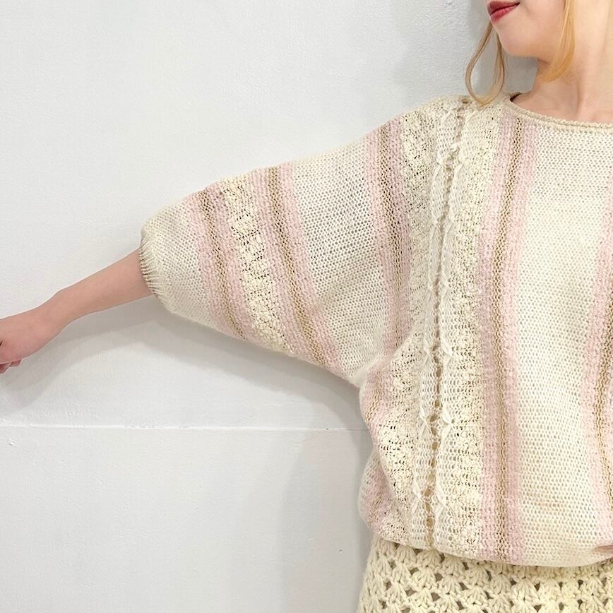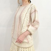 オフホワイトをベースにベビーピンクがアクセントになったデザインニット