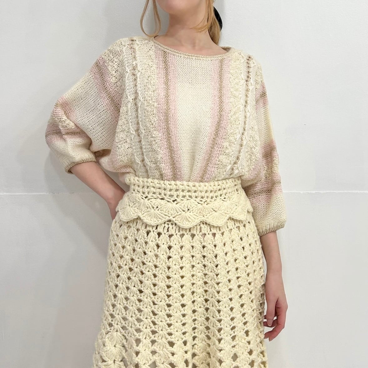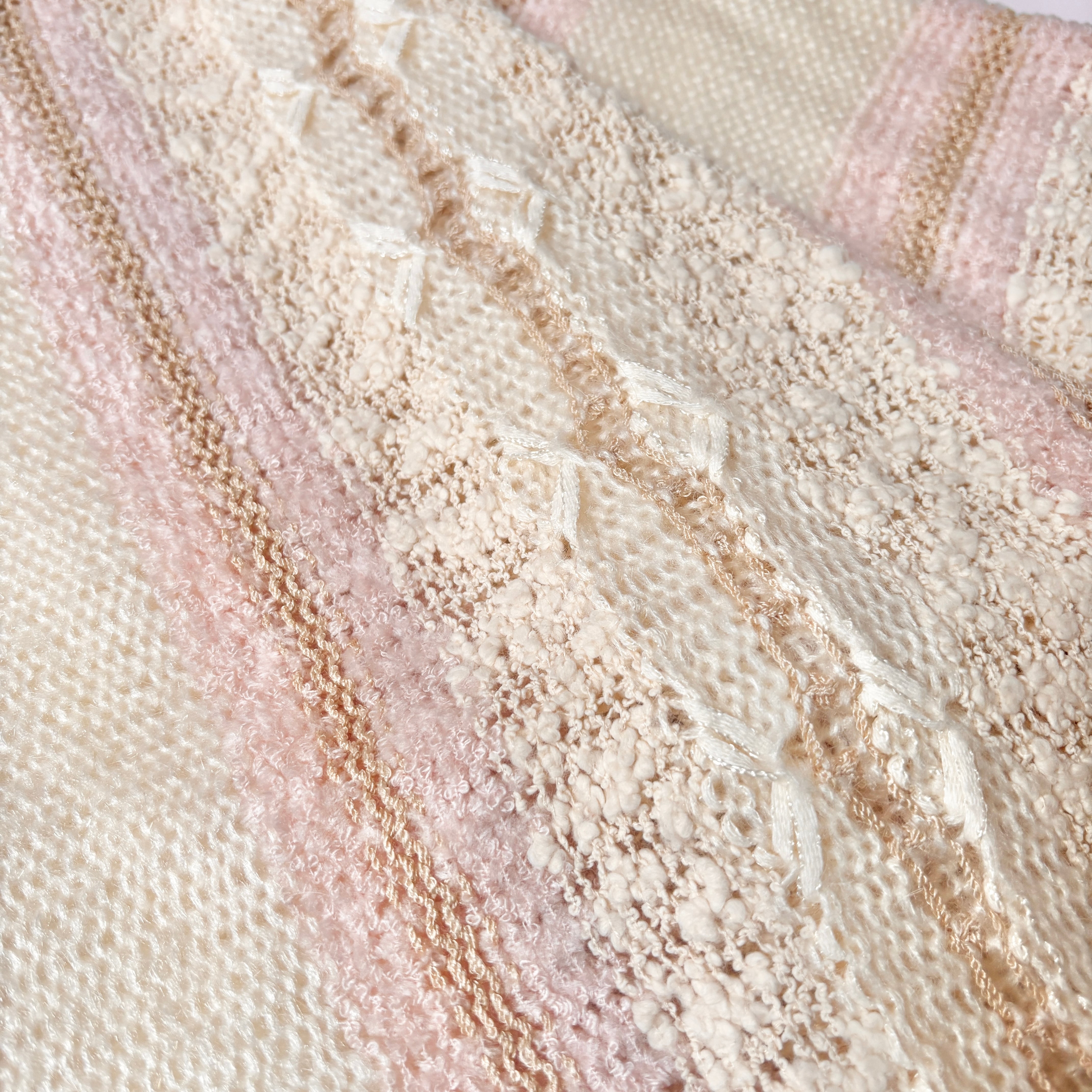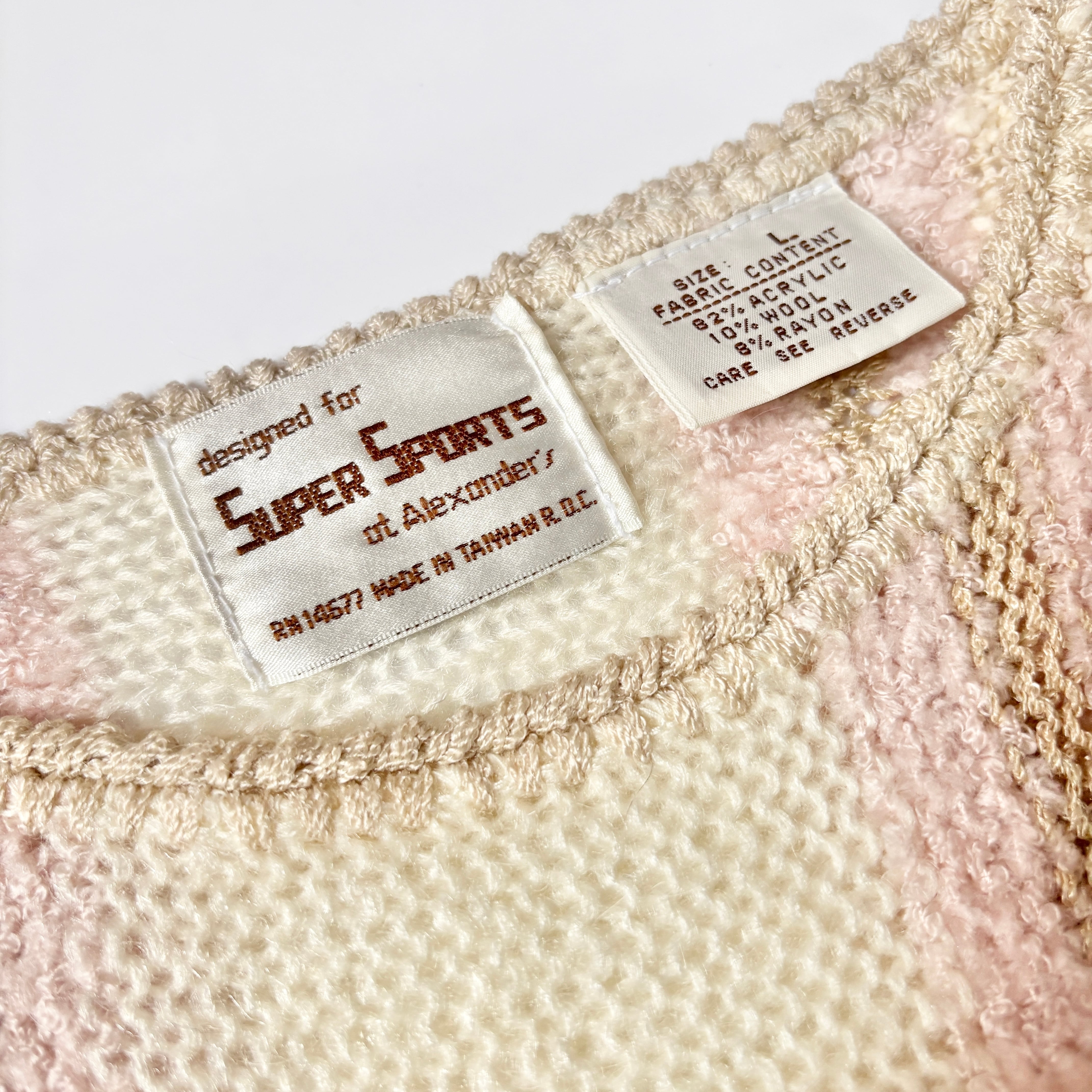 オフホワイトをベースにベビーピンクがアクセントになったデザインニット