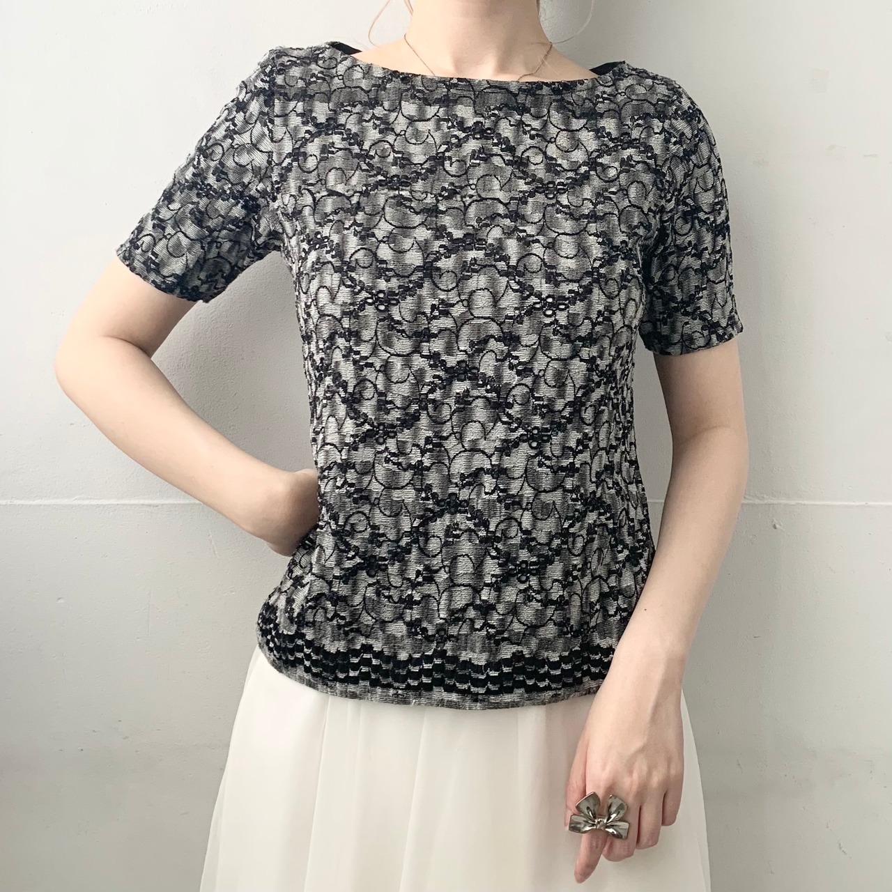 グレーベースにブラックカラーの模様がシックな印象のストレッチトップス。