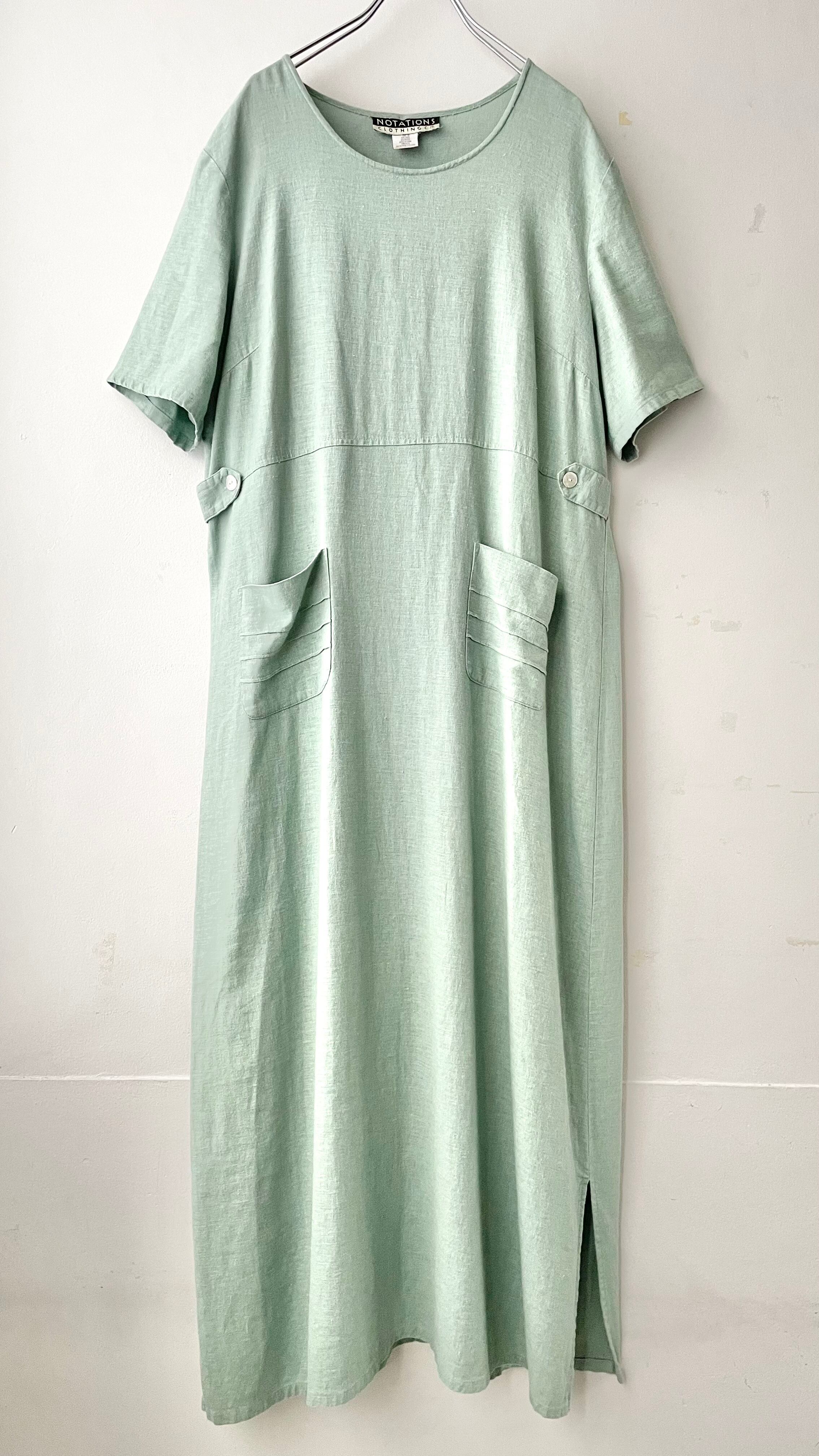 落ち着いたミントグリーンのリネンブレンドワンピース。