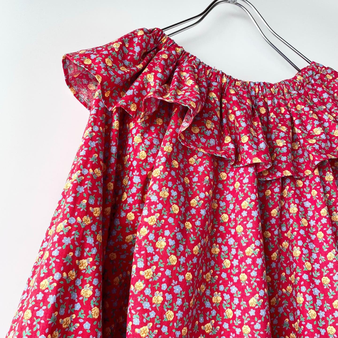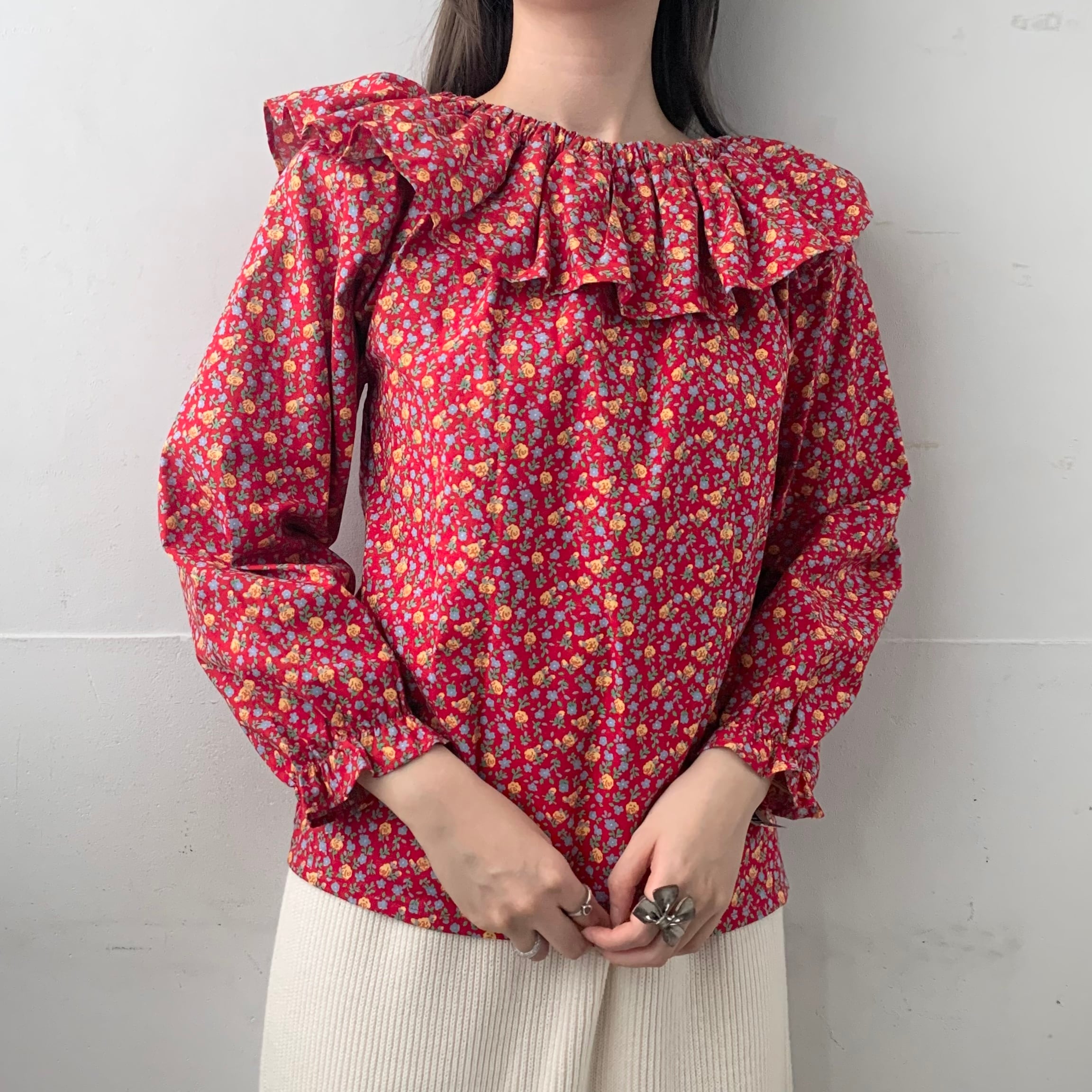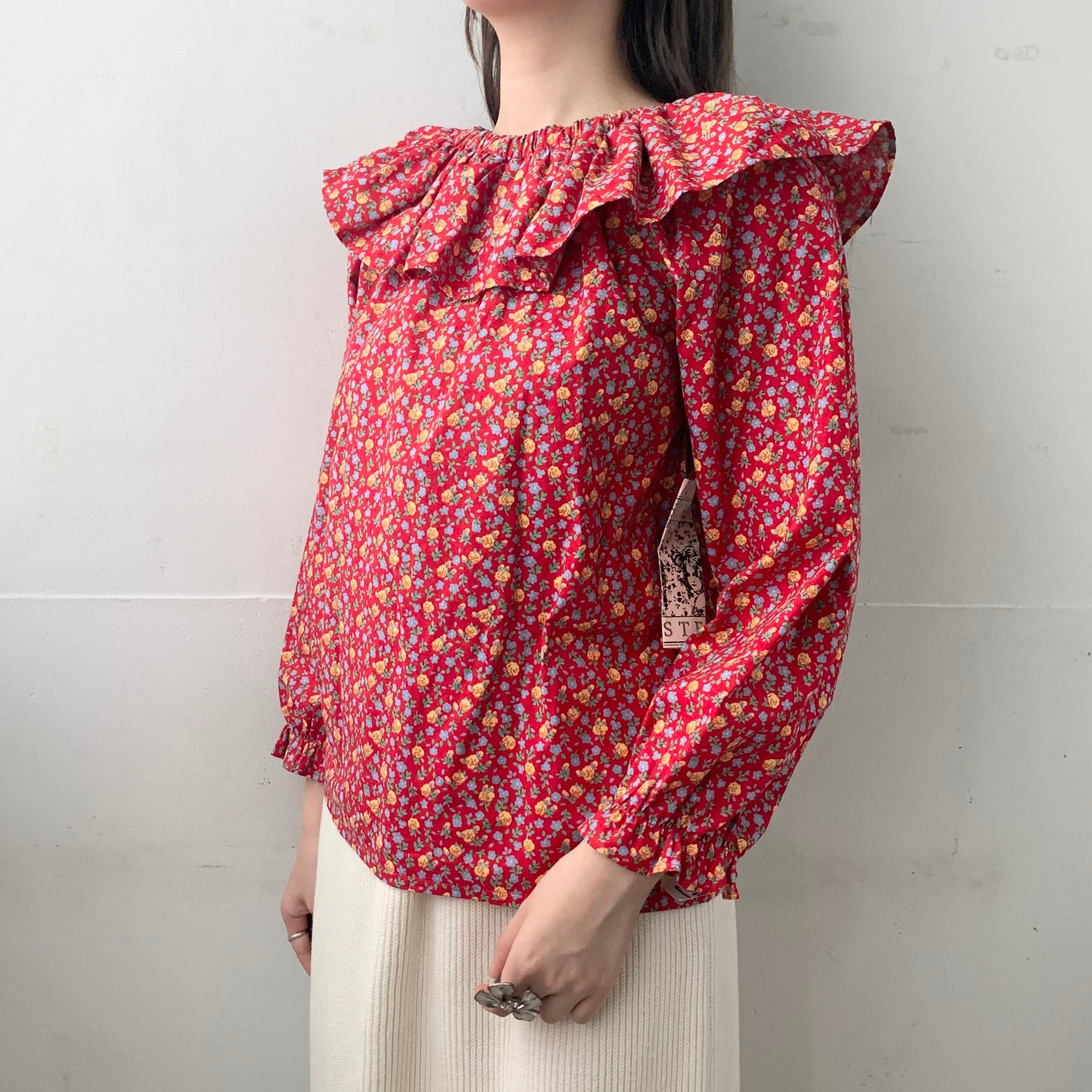 パッと華やかな赤ベースにイエローとブルーの小花柄がガーリーなブラウス。タグ付きdead stockのアイテム。