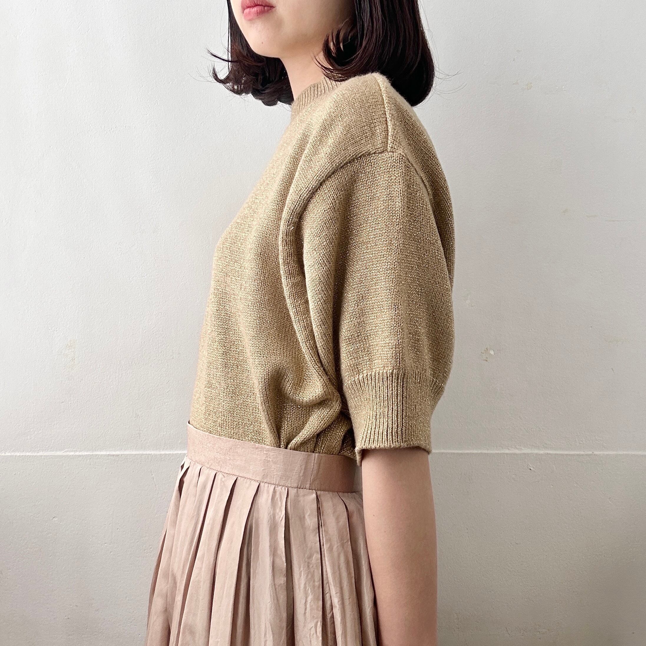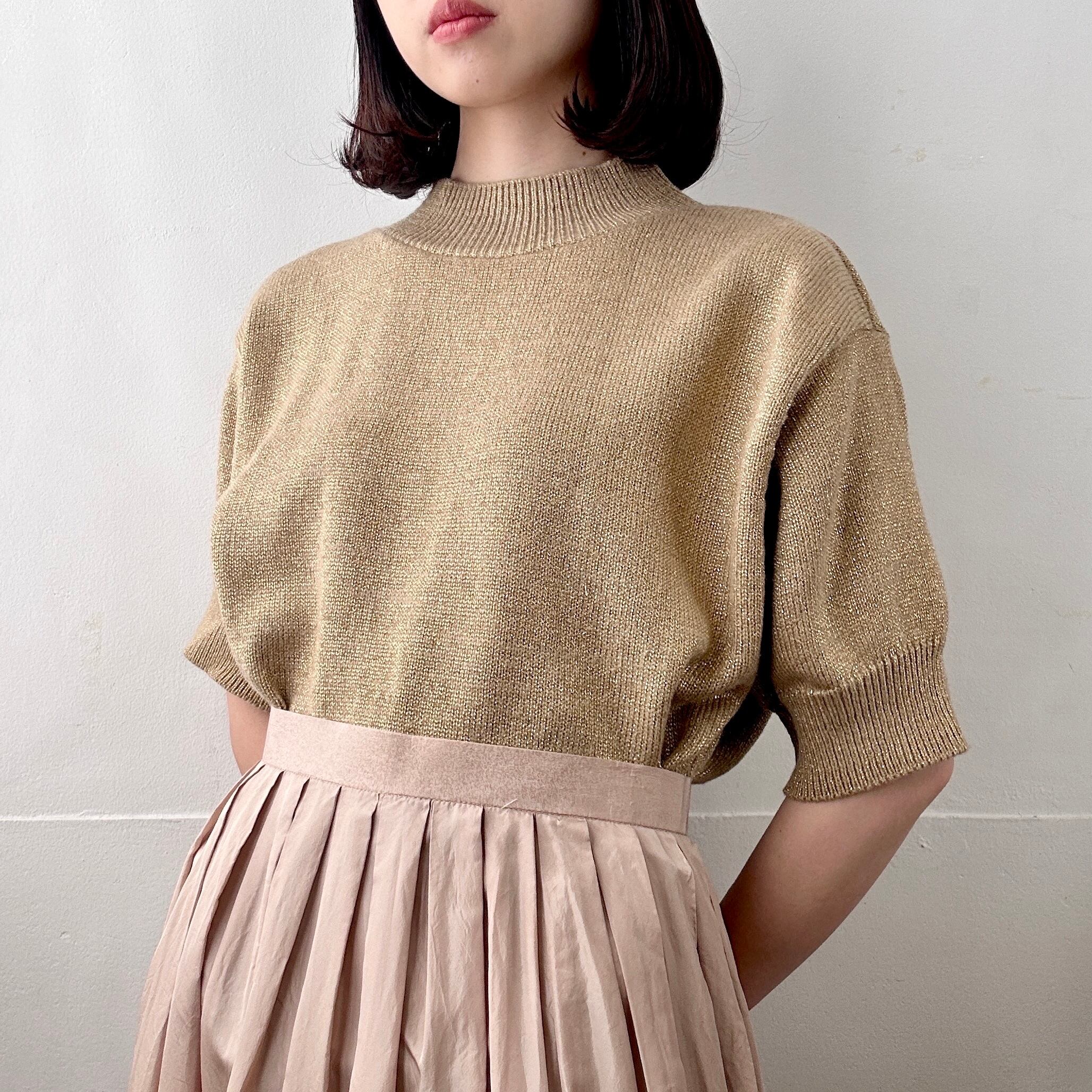キラキラと光るラメが編み込まれたゴールドカラーのニットトップス。