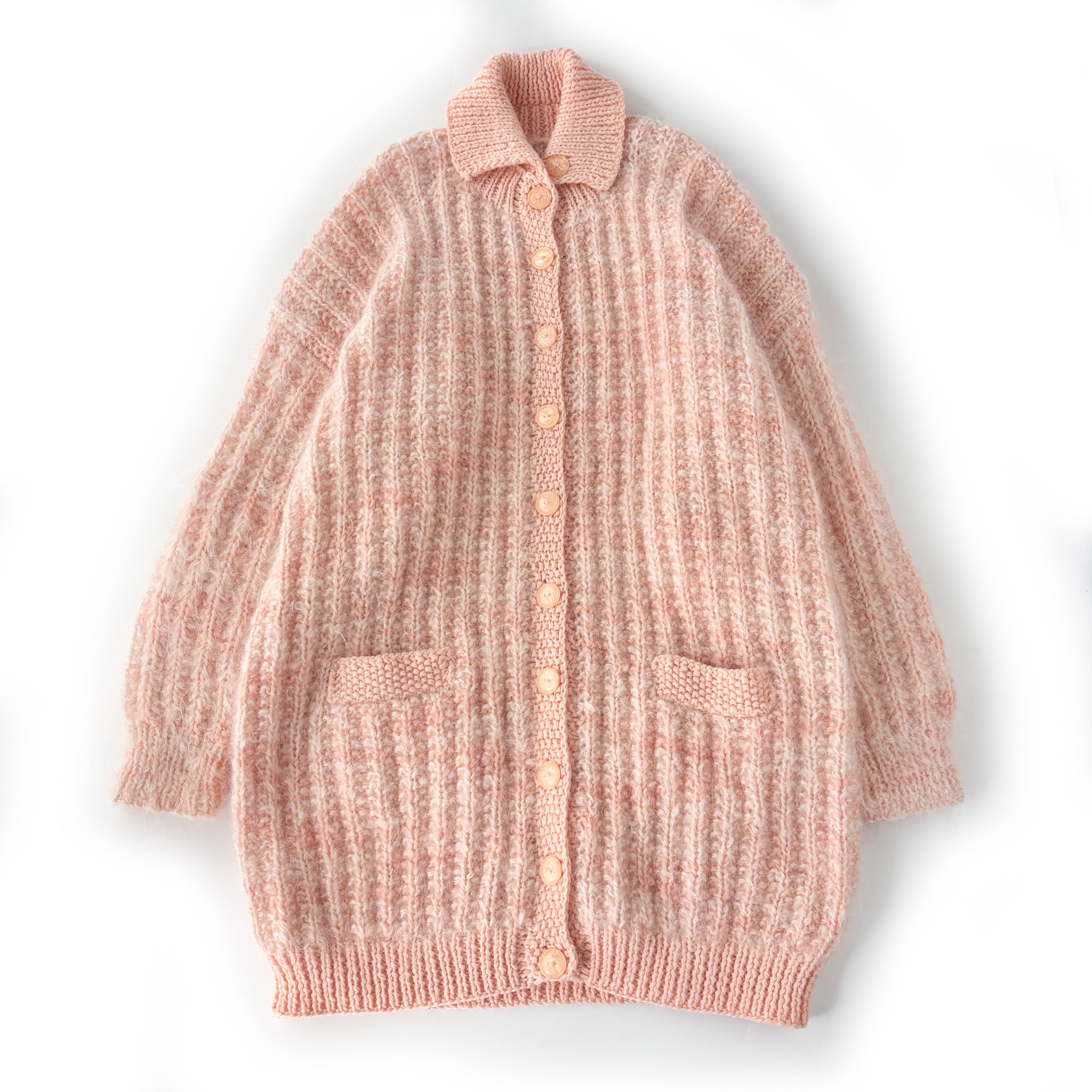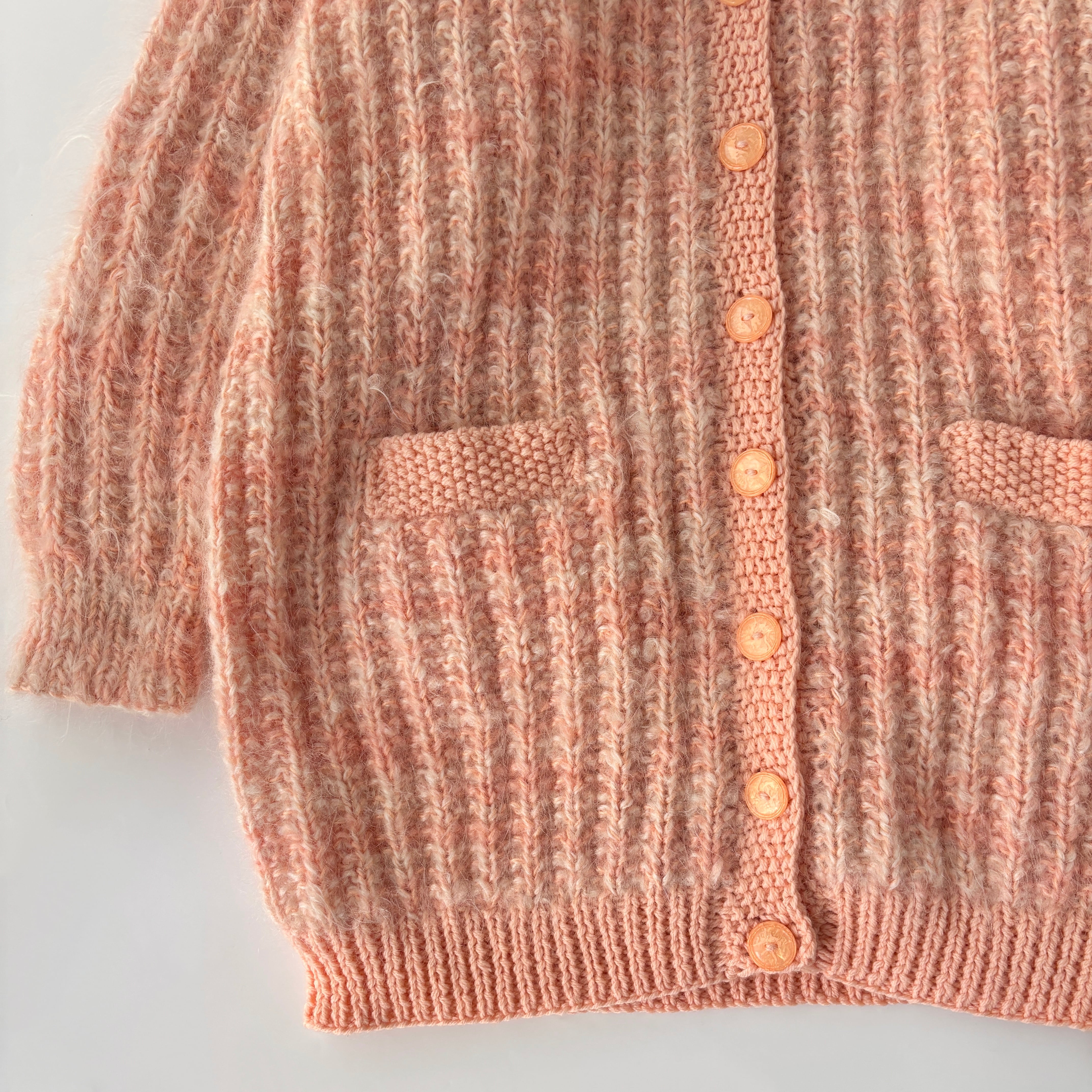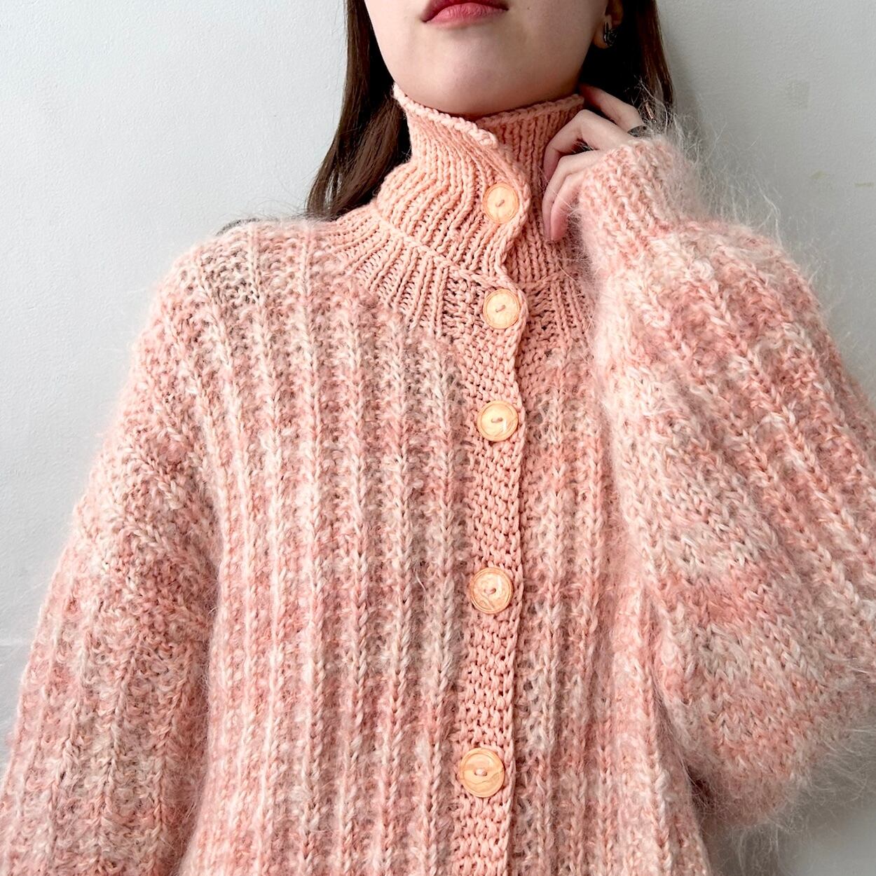 サーモンオレンジのマーブルカラーなロングカーディガン。