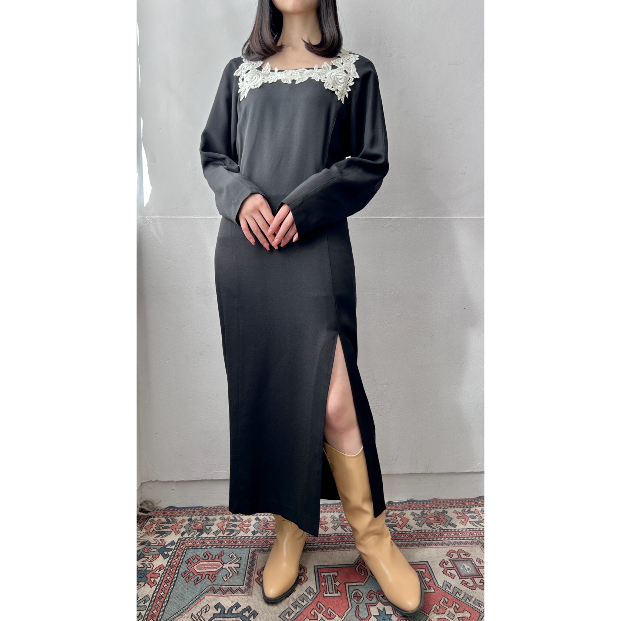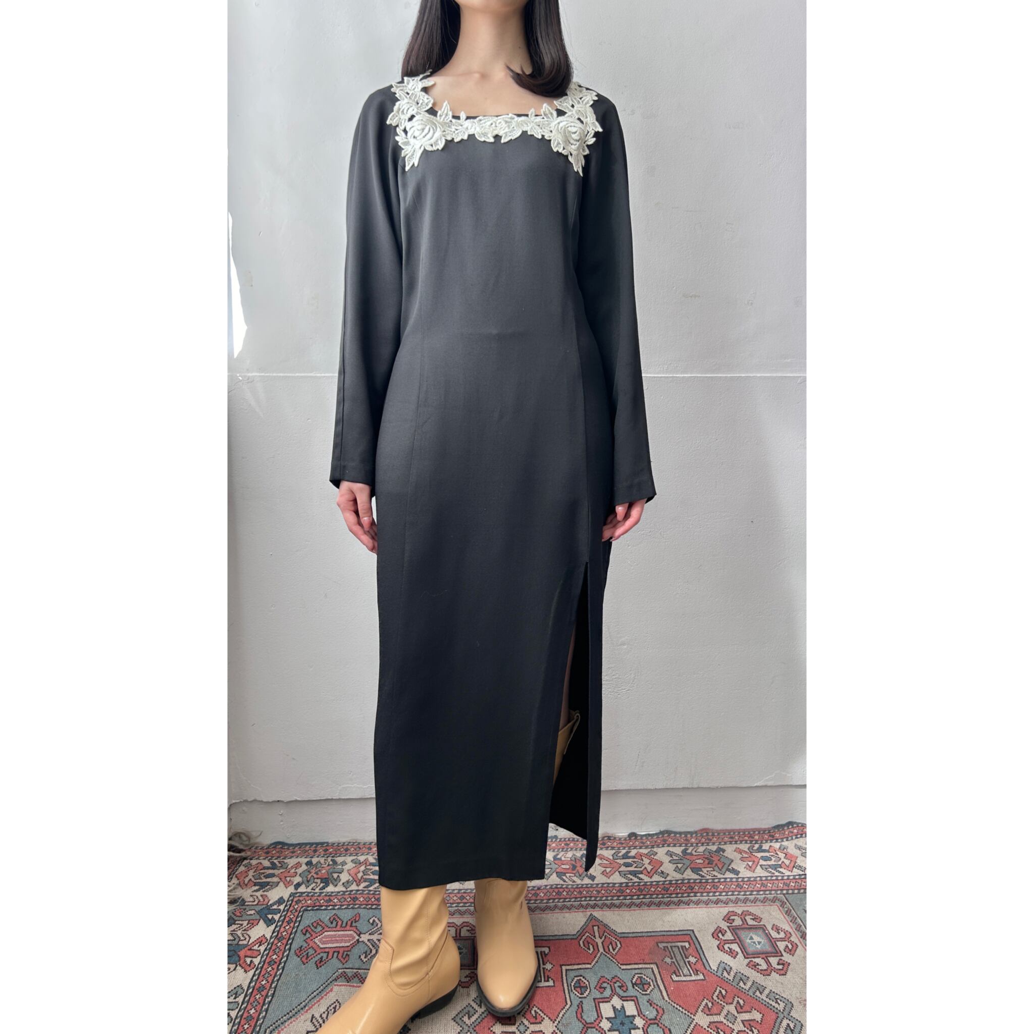 ブラックカラーに濃密に編まれたお花のレースが引き立つモノトーンワンピース。