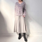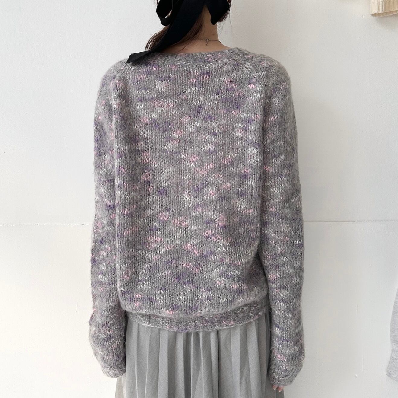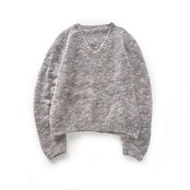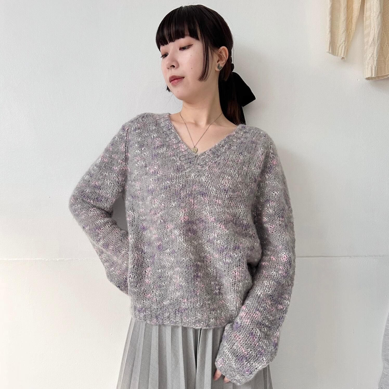 ふわふわ毛足の長い毛糸でざっくり編まれたVネックニット