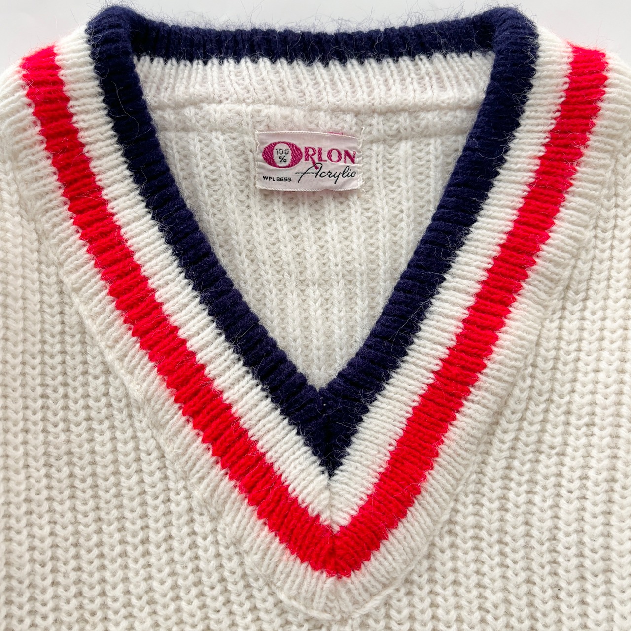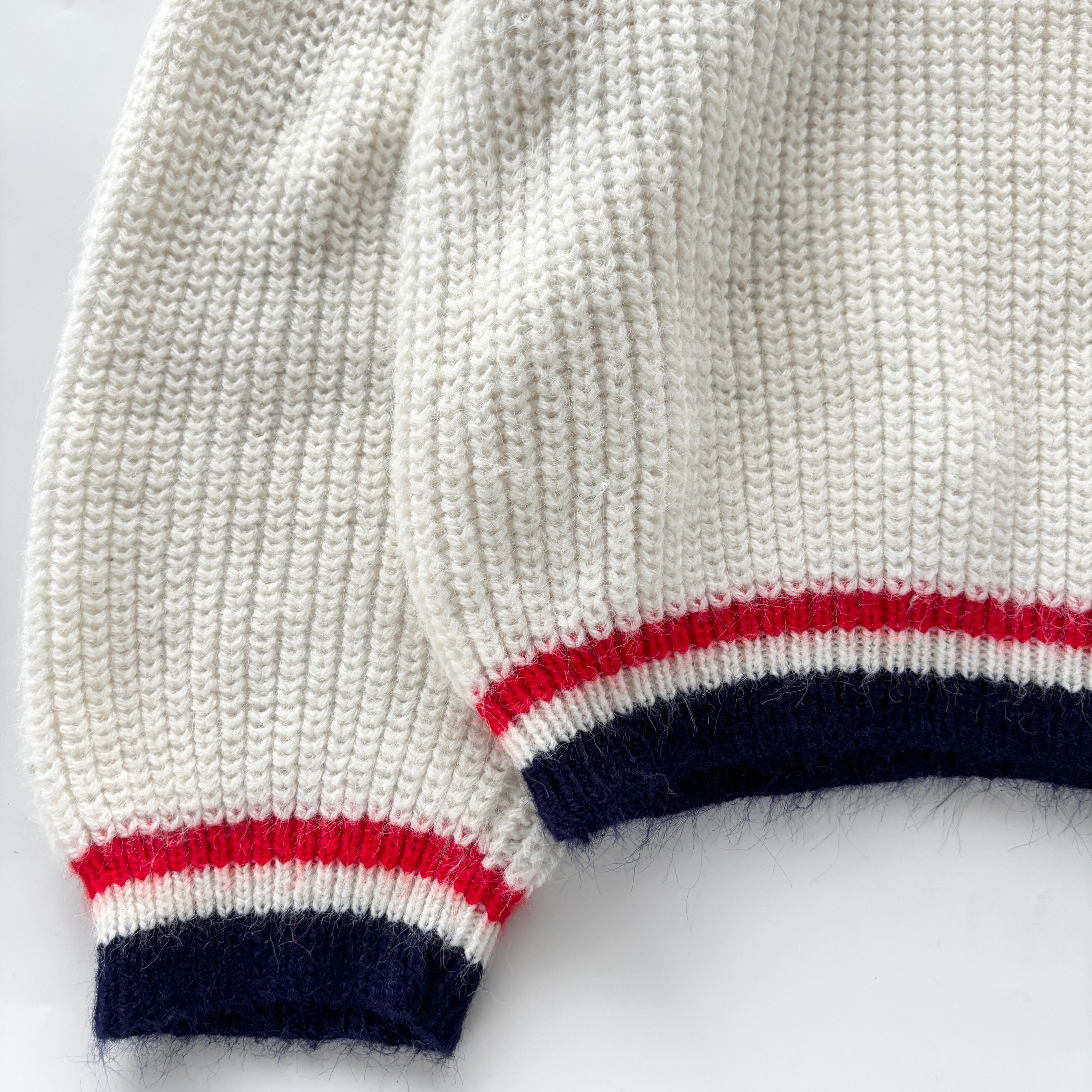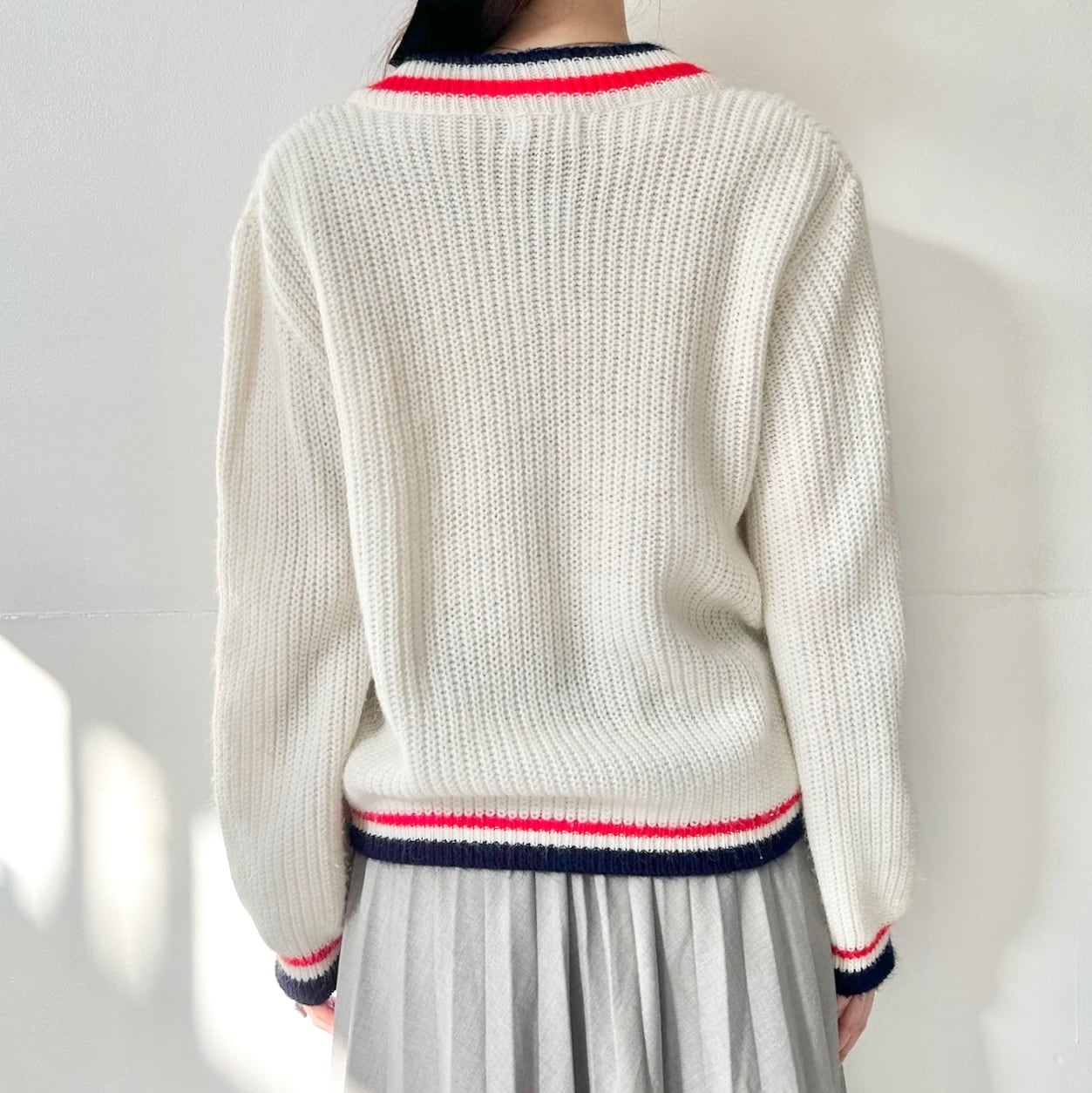 ネイビーとレッドのラインデザインがレトロなVネックニット